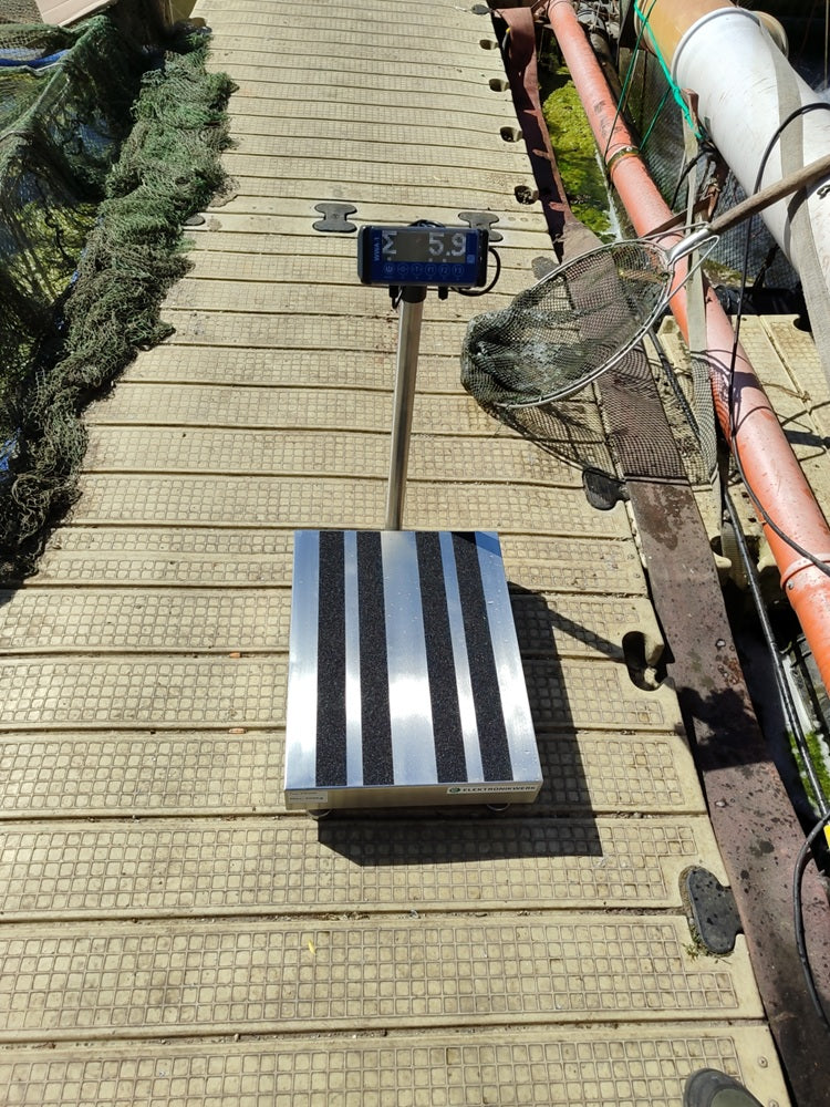 De gebruiker betreedt het platform met een leeg net. Het gewicht wordt opgeslagen en dient als leeggewicht.